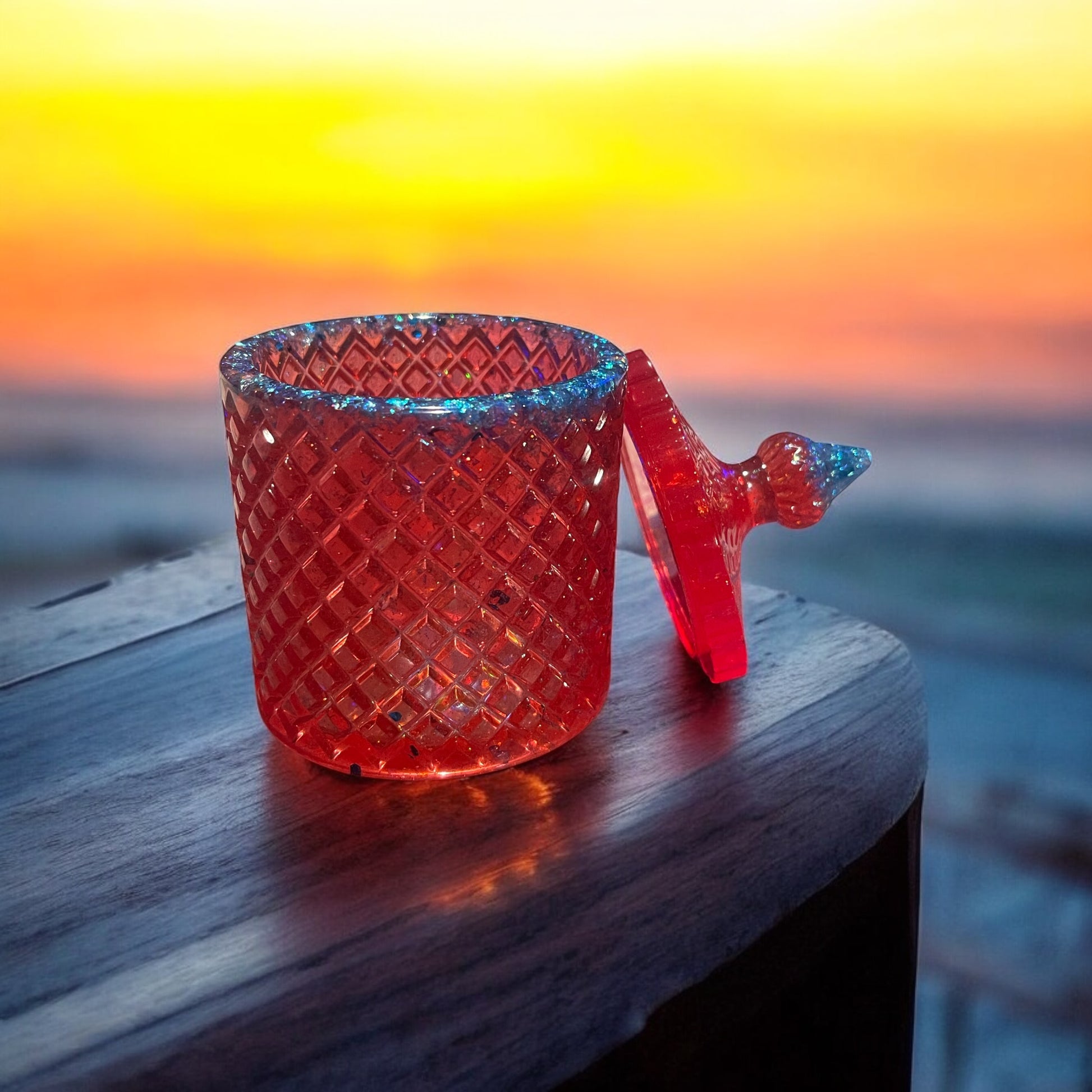 Add a touch of magic to your treats with these enchanting Resin Candy Jars. Perfect for storing your favorite sweets, these handcrafted jars bring both charm and functionality to any space. The Blue Glow-in-the-Dark Jar shines with a soothing teal hue by day and emits a gentle glow at night, creating a whimsical ambiance that’s sure to catch the eye. The warm-toned Brown Jar, with its rich amber color and classic diamond pattern, evokes a cozy, rustic feel. Whether displayed on a countertop or used as a unique gift, these jars bring a playful elegance to your candy storage, making every treat feel a little more special.